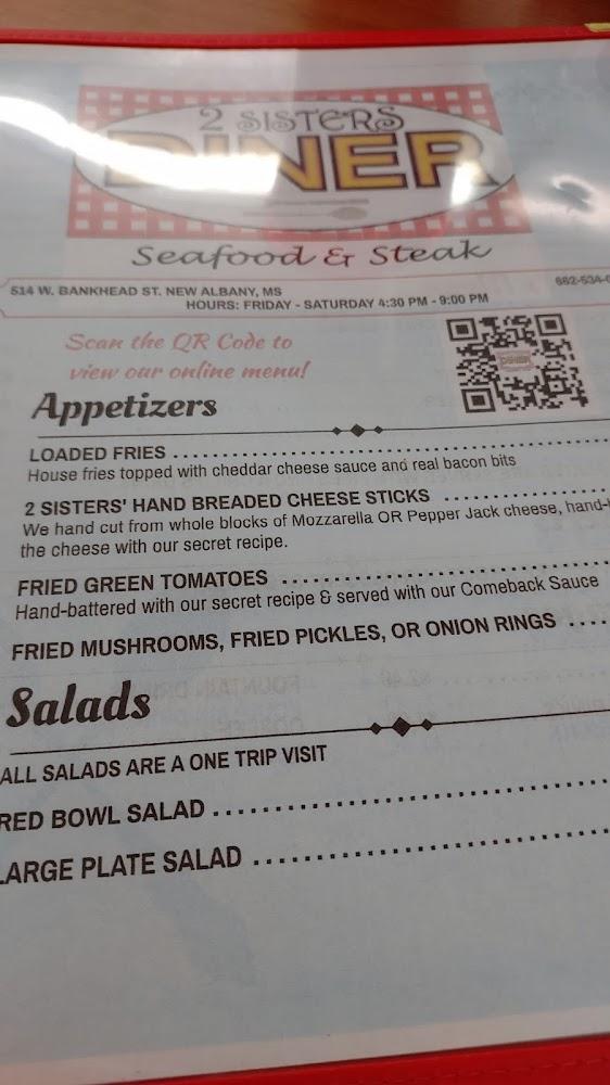 Welcome to 2 Sisters' Diner Seafood & Steak, your go-to spot in New Albany for delicious meals and a warm, inviting atmosphere. Located at 514 W Bankhead St, we specialize in hearty breakfasts, savory lunches, and delightful dinners, all served with a side of Southern hospitality. Our menu features fresh seafood, juicy steaks, and local specialties, ensuring there's something for everyone. Enjoy our range of coffees and teas, or try our popular salad bar and healthy snack options. With accessible facilities and a laid-back vibe, 2 Sisters' Diner is perfect for families, solo diners, and groups alike. Join us for a meal today!